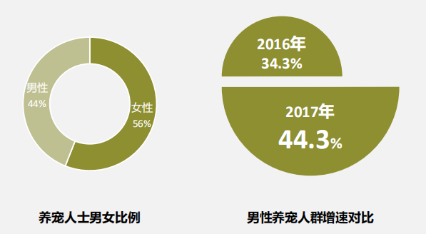 2017年数据统计,养宠物的女性比例达到56%,男性养宠物比例44%。