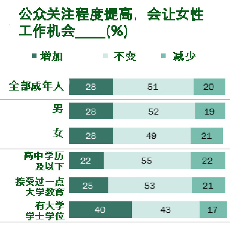 目前,多数美国人不认为以MeToo为代表的反对性骚扰运动能够给女性带来更多的工作机会。只有28%认为,长期来看女性职业机会的增长是有可能实现的。另有20%的人说,这类运动只会带来相反效果——让女性工作机会更少。超过半数的人说这类运动对女性职业机会的发展影响微乎其微。男性和女性在这个问题上的看法十分一致。