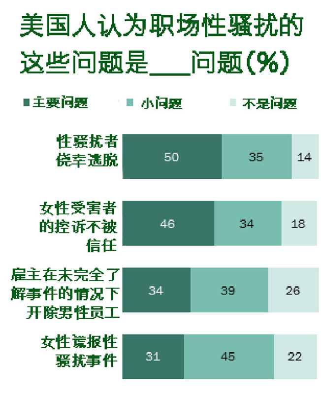 根据皮尤研究中心4月4日发布的一项调查,多数美国人认为“性骚扰者不受制裁”和“女性受害者的控诉不被相信“成为两大主要的问题。其中,女性对这个问题的关注程度比男性更高。52%的女性说“女性受害者不被信任”是个大问题,只有39%的男性持有相同观点。