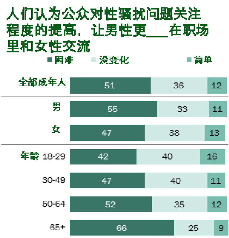 很多美国人相信,随着人们对性骚扰问题的重视程度加深,男性在职场会重新调整他们和女性同事互动的方式。51%的人认为,目前男性在职场上和女性同事交流时遇上了新的困难。只有12%的人持有完全不同的观点,认为两性间的交流互动更加简单了。另有36%的人表示,职场的两性交流不会因为MeToo运动的兴起受到什么影响。