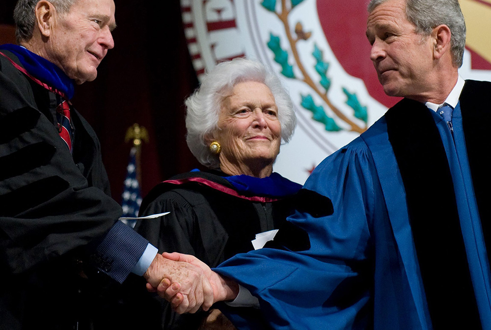 2008年12月11日,美国得州,美国总统小布什(右)在得克萨斯A&M大学毕业典礼上演讲后与父亲、前总统老布什握手,他的母亲芭芭拉·布什站在后面。