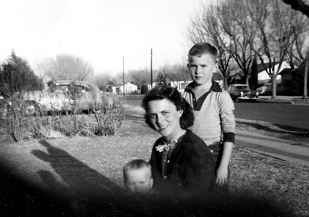 1954年春天,芭芭拉与杰布·布什和乔治·沃克·布什一起,在他们曾经的家——米德兰的西俄亥俄街1412号。
