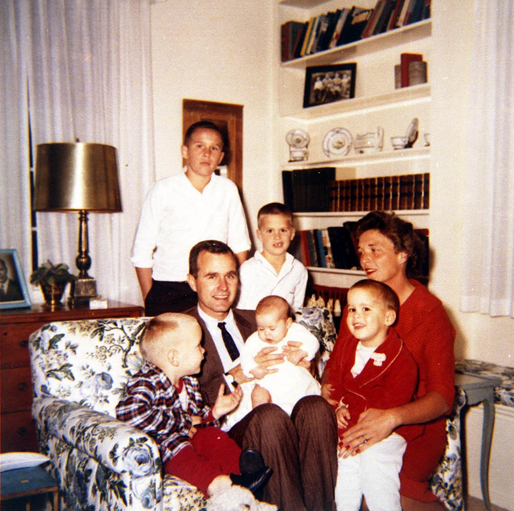 1959年末,布什一家在德州休斯顿。坐着的几位分别是:尼尔·布什,多萝·布什坐在乔治·布什的腿上,马文·布什,以及抱着他的芭芭拉·布什。站在沙发后的是乔治·沃克·布什与杰布·布什。