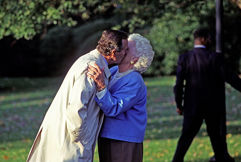 1992年10月23日,华盛顿特区,乔治·布什在离开白宫南草坪时亲吻自己的妻子芭芭拉。芭芭拉与乔治·H·W·布什于1945年1月6日结为夫妇,是美国历史上婚姻最长久的总统夫妻,至今婚姻已步入第73年。