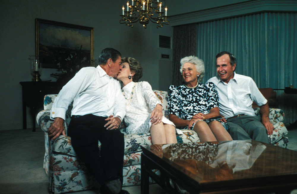 1985年,美国副总统乔治·H·W·布什和妻子芭芭拉·布什笑着注视着美国总统罗纳德·里根和妻子南希·里根的亲吻。