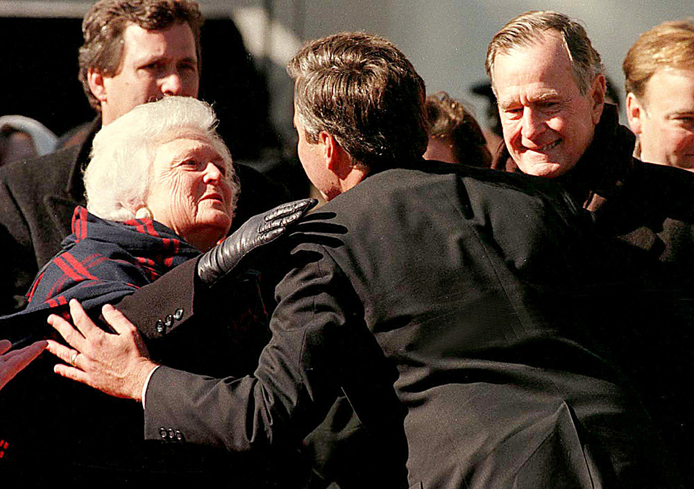 1999年1月5日,杰布·布什在佛罗里达州塔拉哈西宣誓就职成为佛罗里达州第43任州长后,他的父母,前第一夫人芭芭拉·布什和前总统乔治·布什在祝贺他。
