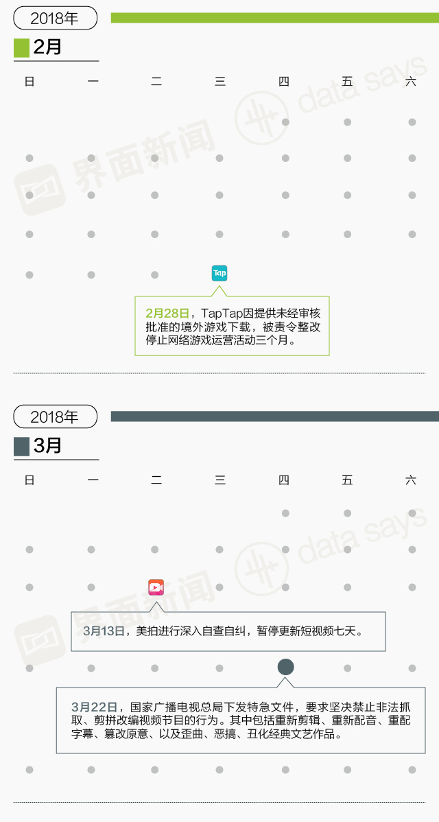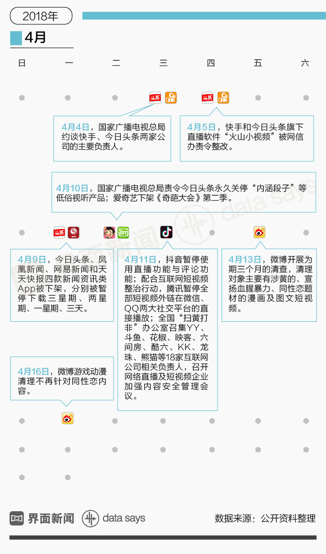 2017年年末,今日头条和凤凰新闻被北京网信办约谈,随后网络内容监管涉及资讯、问答、社区,以及短视频和直播等领域。据界面新闻记者不完全统计,截至2018年4月16日,内容监管最主要集中在视频直播类产品。