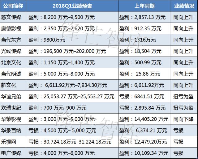 截至4月16日晚,已经有十多家影视行业上市公司发布了2018年Q1业绩预告。Q1对于影视行业来说存在着很多不确定因素,电视剧类上市公司因为回款和确认收入的时间特点,一般在Q4会确认大量收入,Q1大概率是全年收入淡季。而电影类上市公司因为元旦档期、春节档期两大票房收入加持,Q1收入较为可观,且因为2018年春节档的历史性票房数据加成,从电影综合巨头到院线公司都收入颇丰。