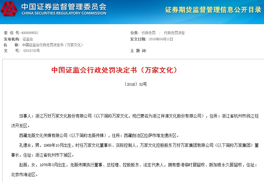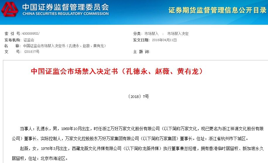 4月16日晚,证监会公布了对万家文化的行政处罚决定书和相关人员市场禁入决定书,驳回了赵薇夫妇、龙薇传媒、万家文化及相关当事人的申辩。