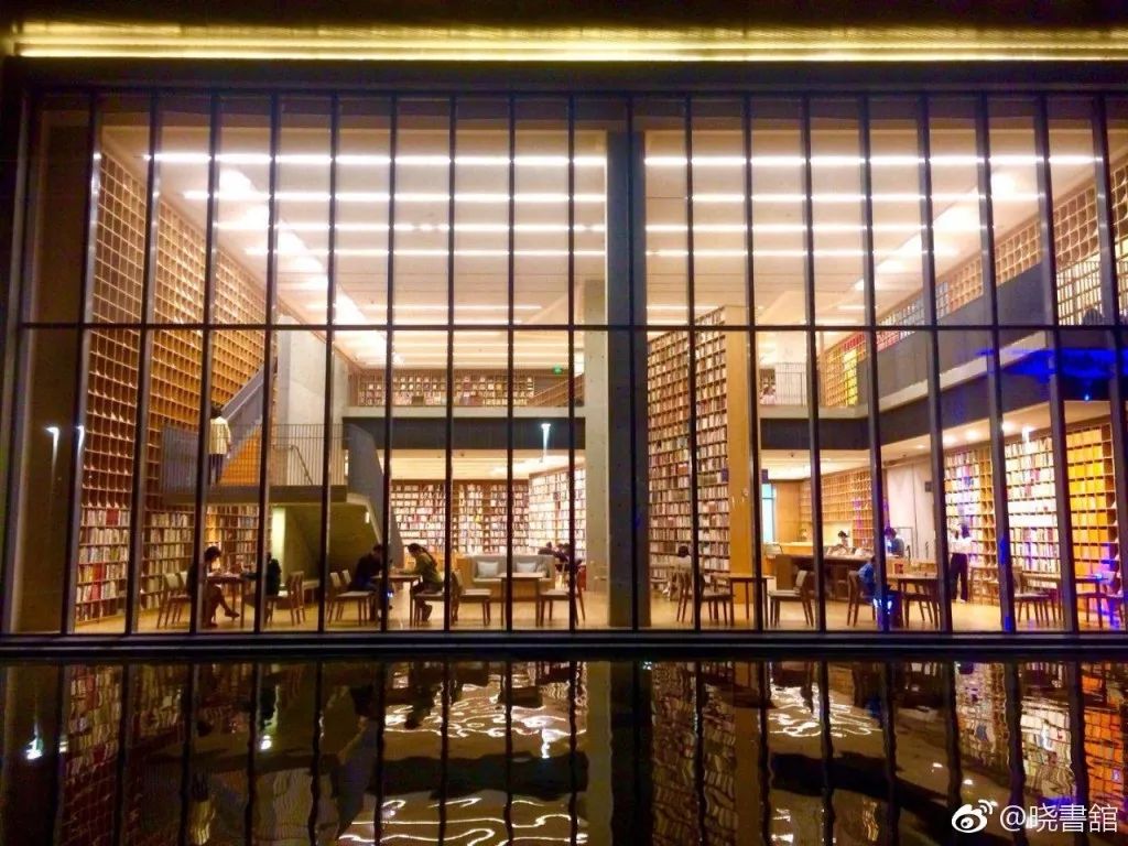 一到夜晚,图书馆内的灯光、窗框、书格倒映在水面
