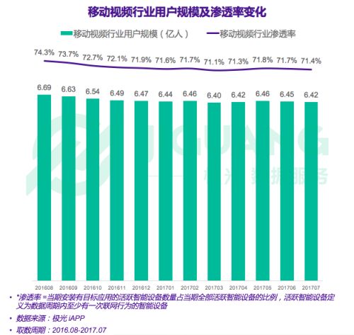 市场研究机构极光大数据发布的《中国移动视频APP行业研究报告》显示,截至去年7月,我国移动视频应用的用户规模已经达到6.42亿,在国内活跃智能设备中的渗透率高达71.4%。