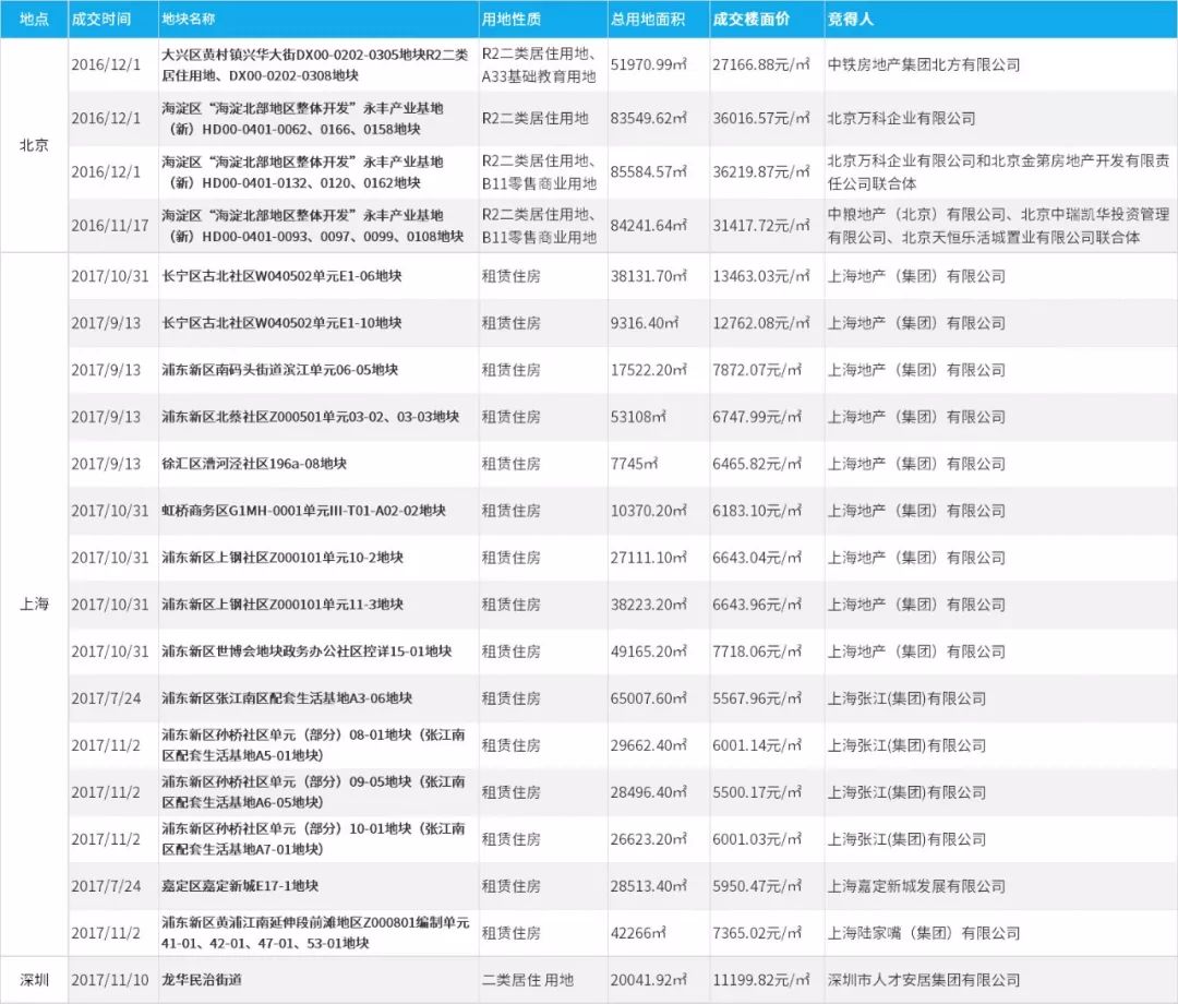 表:三大城市居住租赁地块(70年自持100%)成交情况汇总