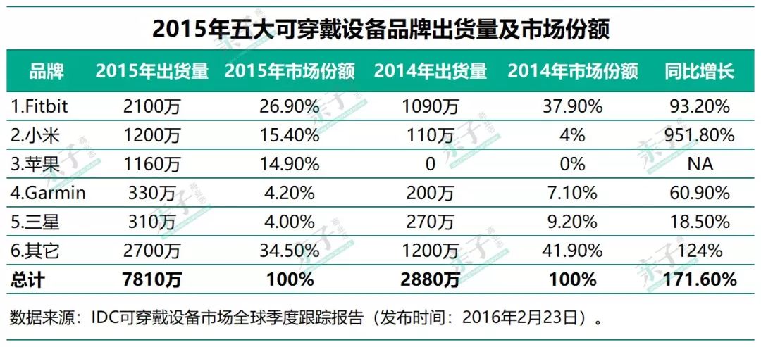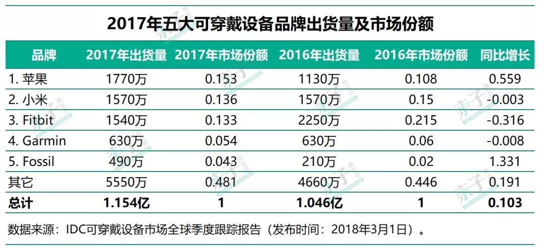 随着苹果、小米为代表的科技巨头踏入可穿戴设备领域,一度引领市场潮流、作为美国首家可穿戴设备上市公司的 Fitbit 市场占有率由2015年出货2100万台的26.9%降至2017年的13.3%,被迫让出可穿戴设备老大的宝座而屈居第三。