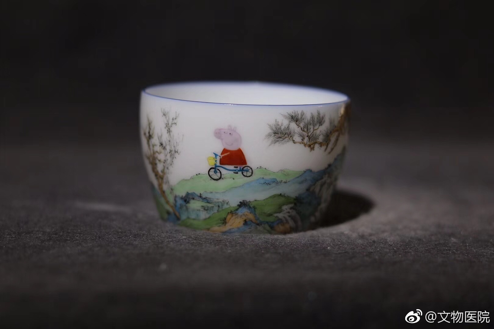 实不相瞒,佩奇早在明清时期就已经流行于我国了,不信请看这款最新出土文物:珐琅彩山水佩奇游春马蹄杯。