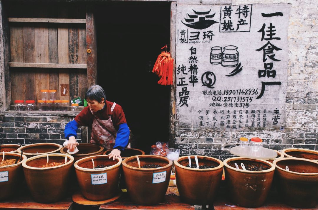 黄姚的早晨,唤醒你的很有可能是那飘香的豆豉味道~这里很多店铺都会卖传统式制作的特产,豆豉、辣椒酱、黄梅酱等等,用大埕子存放摆放在街边兜售,每一样都是物美价廉~