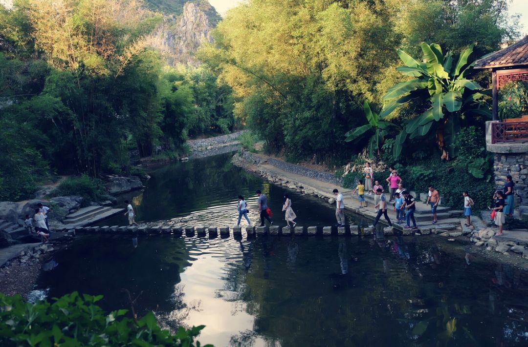 凤凰古城里的沱江跳岩挤满了拍照的游客,而黄姚古镇中的石跳桥却还是独占着清静。这座200多年历史的桥,由31个石头墩子排列而成。踏上石墩,一抬一踏一跳,就好像回到了童年与小伙伴玩耍的时候,全部烦恼都抛到九霄云外……