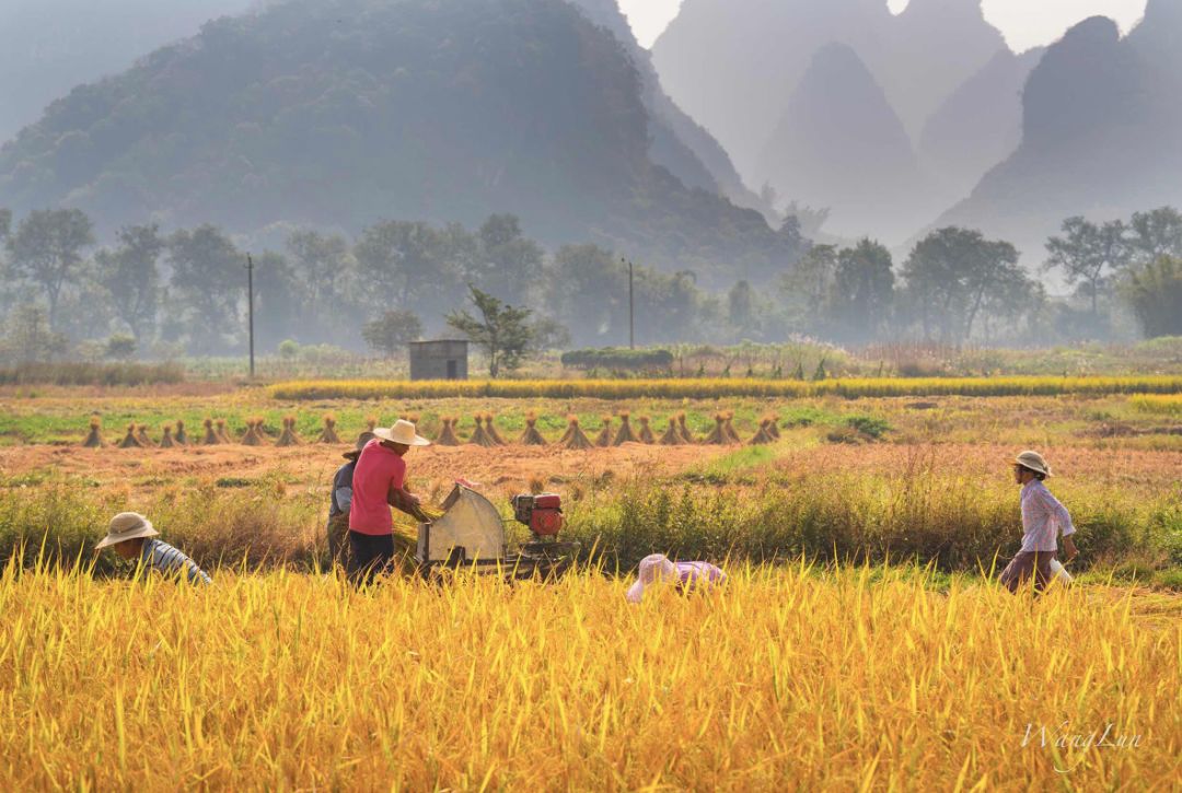 晨曦的柔光笼罩着山头,远处的村庄翠烟袅袅,田埂间有人支起画板写生,有老农在放牛割稻……真想在这片稻田阡陌间无忧地奔跑,又怕扰了这幅清净的山水画。