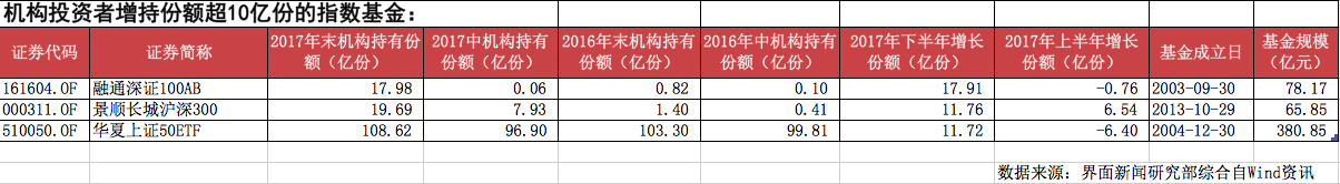 与主动型基金相比,去年下半年机构对指数基金的活跃度要低得多。在有数据可统计的560只指数基金中,只有3只基金的机构持有份额增长超过10亿份。分别是融通深证100AB(161604)、景顺长城沪深300(000311)以及华夏上证50ETF(510050)。