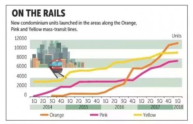 开发商在过去四年中一直争抢着购买所有三条路线的土地,并且提供的新单位数量稳步增加,尤其是2016年以来,沿着橙色线路的地区,开发商在其三条规划线路中开发量比往年倍增。