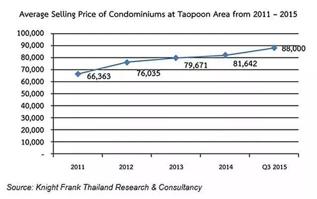 这片地区对公寓的需求不断增长,到目前为止已售出超过8,768套,公寓的销售率平均每年1,800-2000套之间。而且售价也在不断增加,目前该地区公寓的平均价格是 88,000泰铢/平米。这已经比2011年增长了66,3600泰铢。
