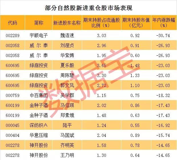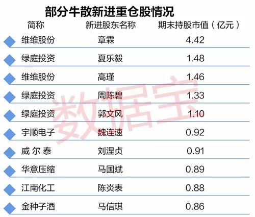 维维股份和绿庭投资是新进牛散期末持股市值超过亿元的股票。其中,章霖新进维维股份10114万股,期末持股市值4.42亿元居首。另外高瑾新进维维股份期末持股市值也超过亿元;夏乐毅新进绿庭投资1339万股,期末持股市值1.48亿元位居次席。另外周陈碧、郭文风两位自然人股东新进绿庭投资期末持股市值也超过亿元。值得一提的是,有些自然人股东新进是由于限售股解禁造成的,比如魏连速新进宇顺电子。