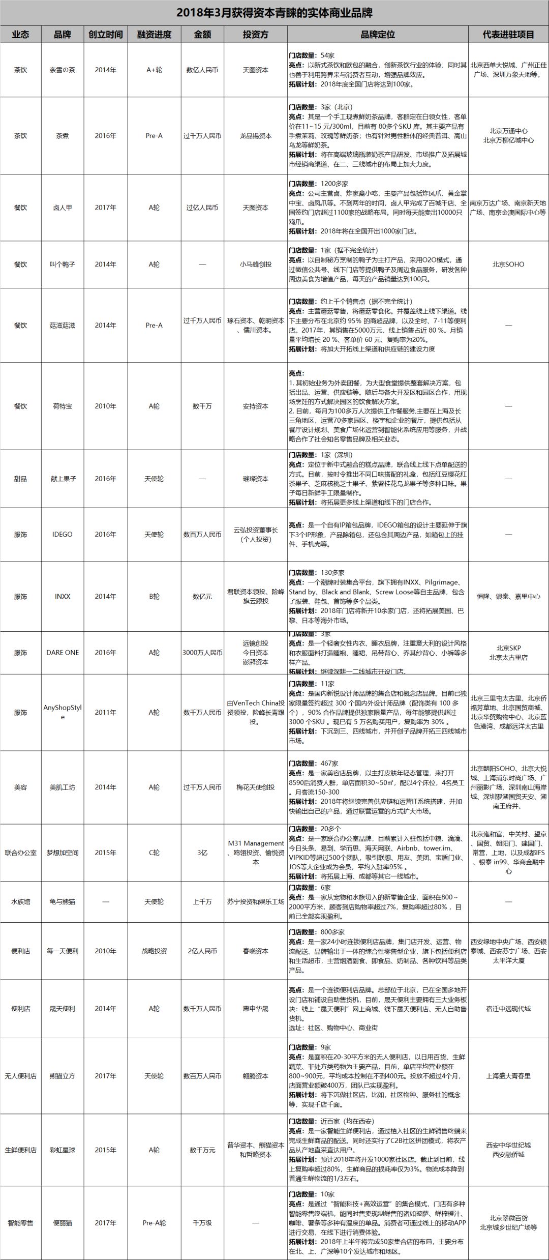 从表格中,我们看出3月份资本关注的有餐饮、茶饮、便利店、服饰、零售、生鲜、联合办公室这些业态,其中: