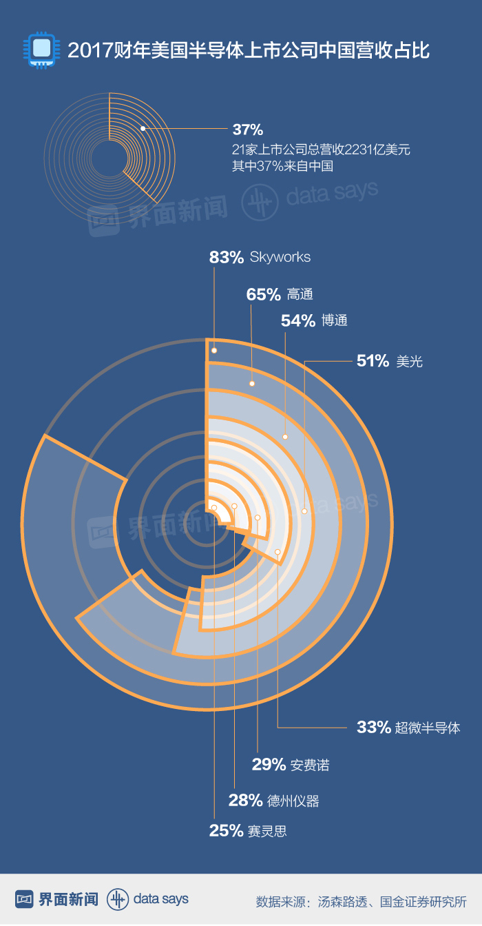 目前,中国已发展成为全球最大的集成电路(即芯片)需求市场。2017年,高通、博通美国21家半导体上市公司有37%的营收都来自中国,其中Skyworks的中国营收占比高达83%。