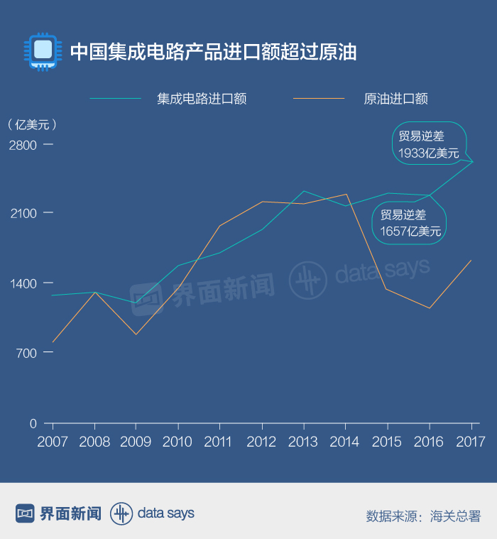 海关总署数据显示,2017年中国集成电路进口额达到2601亿美元,大幅超过原油进口额;贸易逆差接近2000亿美元,较上年增加近300亿美元。