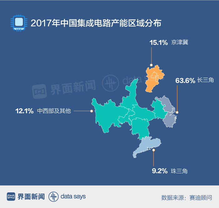 如今,中国集成电路产能主要集中在长三角、珠三角、京津冀和中西部地区,其中,长三角的产能占比高达63.6%。