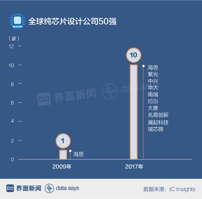 在近几年的奋力追赶下,中国“芯”的国际地位已经有所提高。IC Insights报告显示,在全球纯芯片设计公司50强中,2009年只有1家中国公司入选;到2017年,上榜中国公司数量增长到了10家。