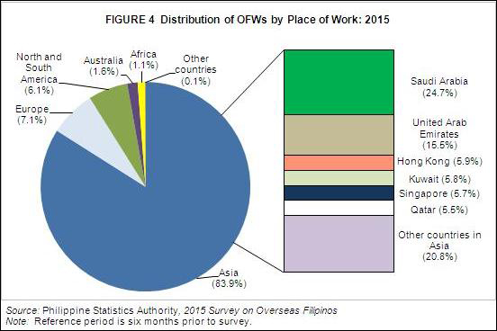 菲律宾统计局2015年的数据显示,海外菲劳主要分布在亚洲,沙特阿拉伯是其最大目的地。2015年4月至9月,海外菲劳为菲律宾带来的外汇收入共约1803亿比索(约人民币217亿元)。
