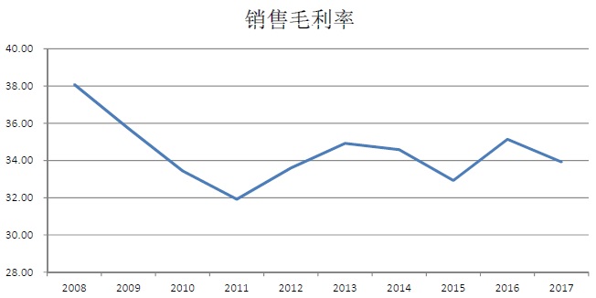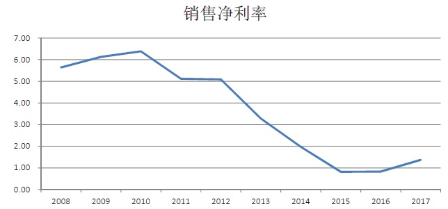 不过,长期来看,三全食品的利润率大致经历了一个滑坡的过程。2013年之前,三全食品的销售净利率还可以维持在5%以上,但2013年及之后,净利率大幅滑坡,2015年和2016年甚至不到1%。毛利率滑坡幅度不大,但从2011年开始就位于相对较低的位置。