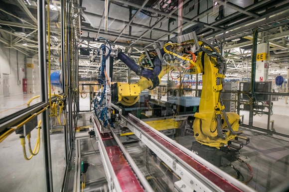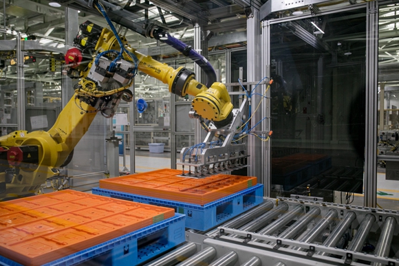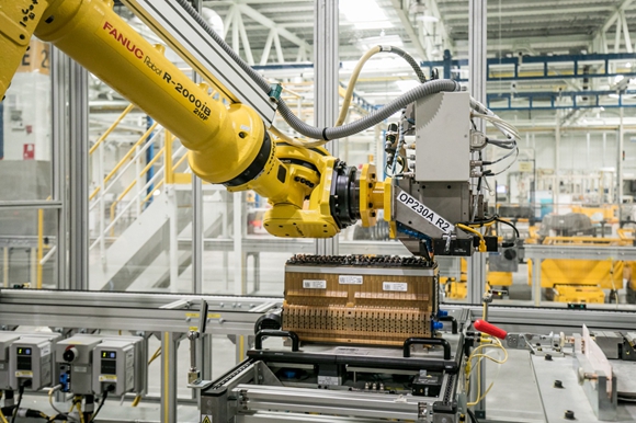 值得一提的是,上汽通用汽车动力电池系统发展中心的电池组装配智能生产线和工艺流程,彰显了自动化、数字化和网联化的智能制造理念。电池模组装配线通过大量拥有智能视觉的机器人或机械手完成电芯和模组的上料、装配、运输和测试,自动化率高达100%。