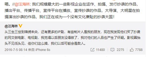 网文抄袭的例子告诉我们,如果放任抄袭作品壮大,就会产生尾大不掉的后果,编剧汪海林就曾对此多次吐槽。