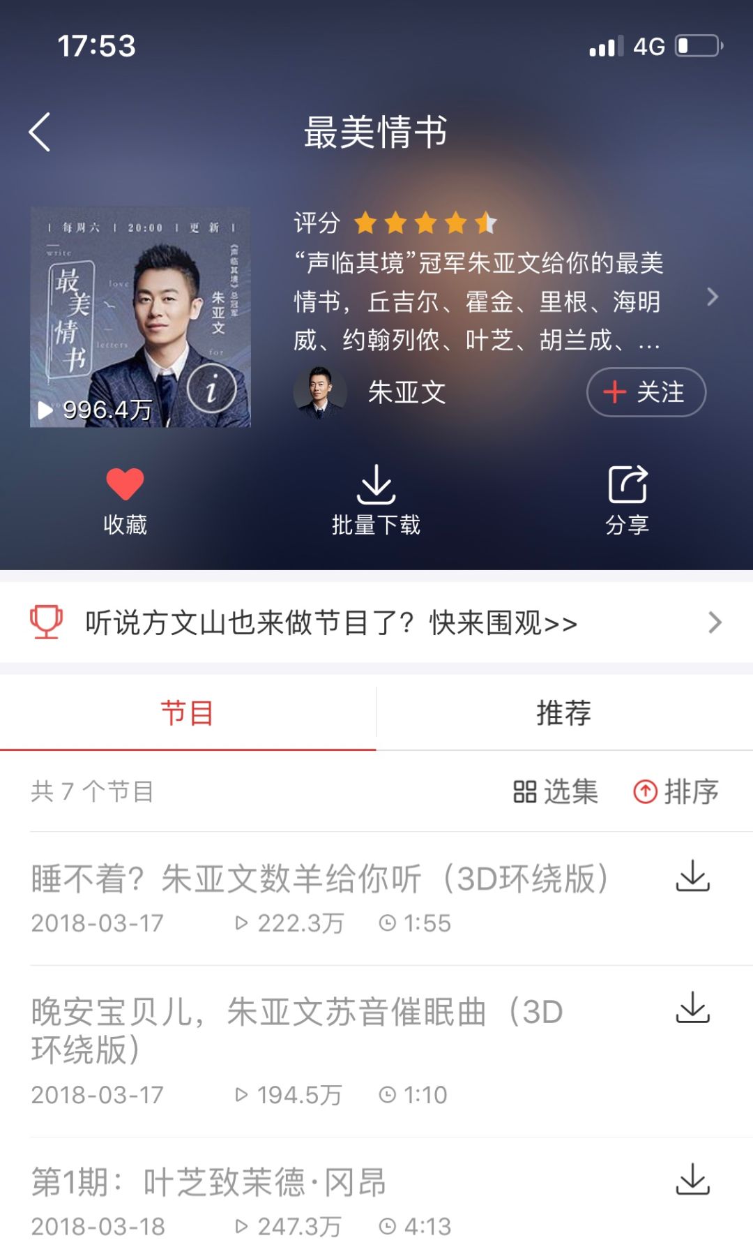 冠军之夜后的第一天,同样深耕声音领域的蜻蜓FM与朱亚文打造的独家音频栏目“最美情书”上线。公开资料显示,节目上线首日收听便突破百万,众多粉丝前来节目评论区“打卡”。目前,花絮节目《睡不着?朱亚文数羊给你听》的播放量就已超过200万。