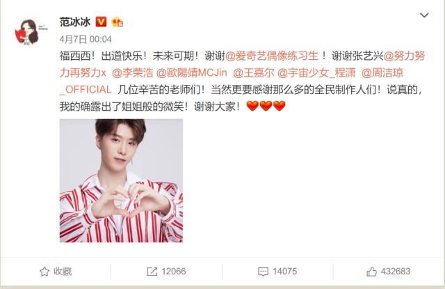如此高频的发微博次数,可见范冰冰的用心良苦。要知道,现在微博已经成了明星们的商业手段。根据不同咖位的明星,每条微博的价格也是门道不同。而极具影响力的范冰冰不但紧跟《偶像练习生》的节奏,还多次应援弟弟,并@爱奇艺偶像练习生,其中的动机,是姐姐责任>利益合作。