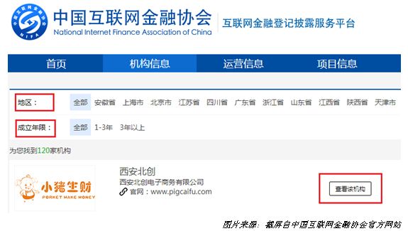 1、登录中国互联网金融协会官方网站(https://dp.nifa.org.cn/),选择“机构信息”,查找到相关的机构并点击“查看该机构”。