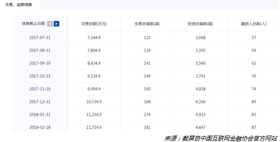 3、在该机构的“平台运营信息”,可以查看历史“交易、逾期信息”,以判断该平台的运营健康情况,作为投资参考。
