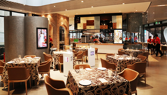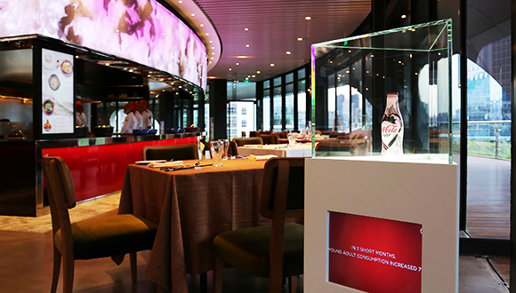 该主题餐厅名为“东方明珠Coca-Cola欢乐餐厅”,地处浦东陆家嘴中心区域东方明珠电视塔内。从东方明珠塔往下看,餐厅所在最下层平台形状就是一个可口可乐瓶盖。餐厅采用开放式厨房,在以太平洋、大西洋、印度洋等全球5大板块划分的就餐区内,消费者可以品尝到中式、日式、西式、东南亚等多种菜系。