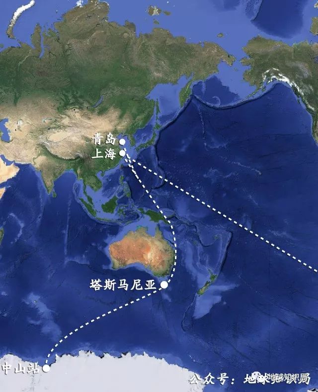 上海、青岛一南极中山城站航线可分为上海、青岛—澳大利亚—南极中山站两个航段。上海、青岛—澳大利亚航线与商业航线一致,而在经过澳大利亚塔斯马尼亚岛后,则需向南越过航行条件复杂,多大风巨浪的西风带才能抵达中山站。