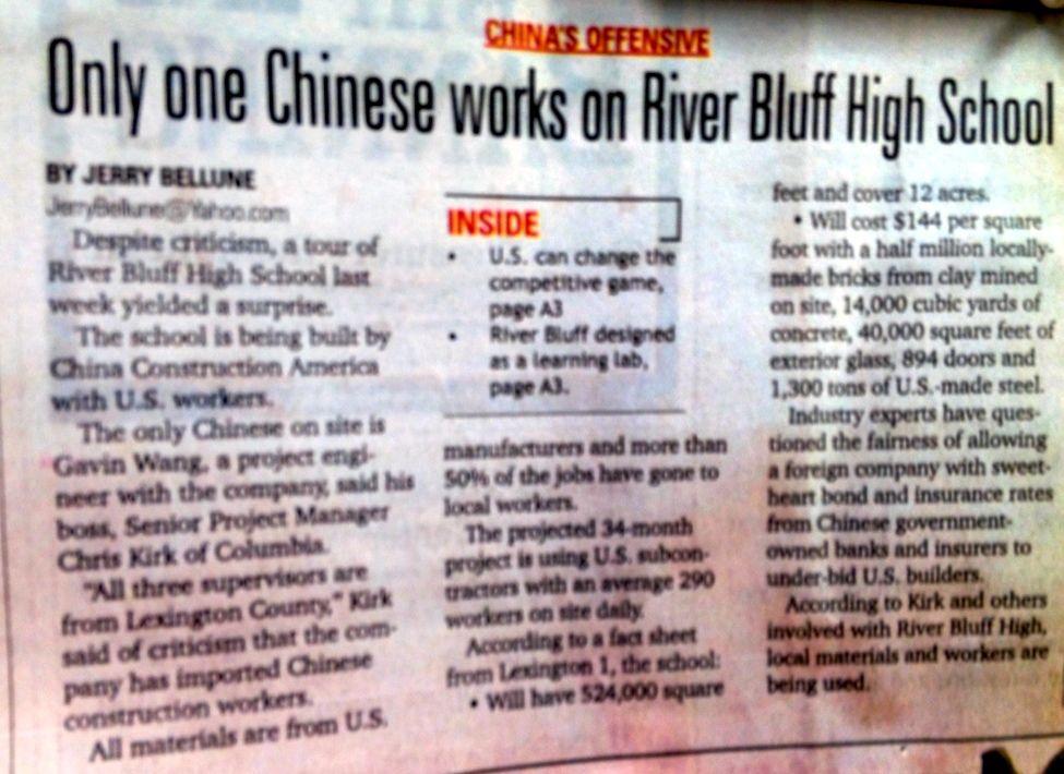 中资企业在美国的生存并远没有外界想象的那样简单、拿了项目就圈钱,日子也远没那么滋润。几年前我去南卡的中建美国公司,在办公室的墙上看到一则和他们有关的报道被精心装裱起来,报道是关于他们承接的南卡罗来纳州首府哥伦比亚的河畔布拉夫高中(River Bluff High School)项目,文章的标题是:“只有一个中国人在河畔布拉夫高中施工”。放在中国人抢走美国饭碗的舆论背景下考虑,就会明白“只有一个中国人”几个字不仅给美国人带来了安心,也给中建美国公司带来了回旋的余地,在不友好甚至讨伐意味浓厚的舆论氛围中冲出重围。