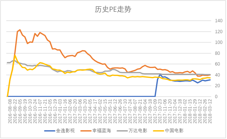 根据2016年以来幸福蓝海、中国电影、万达电影以及最新上市的金逸影视的估值分析,万达电影的高收入并没有给公司的估值带来太高的收益,反而和金逸影视、幸福蓝海等二三线影院企业的估值没有太大差异。市场平均估值约为30-40倍之间。