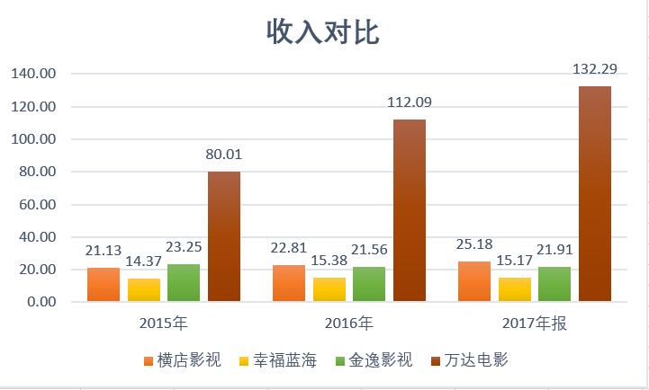 从上图中不难发现,在同行业中,万达电影的收入水平比同行业的横店影视、幸福蓝海以及金逸影视高出了不止一个数量级。