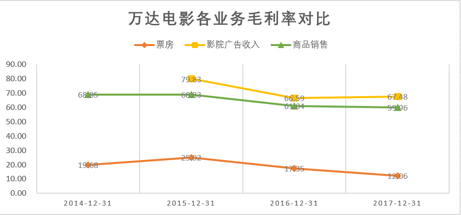 从毛利率数据对比来看不难发现,票房业务的毛利率并不高,并且持续在下滑。相反,院线广告收入以及商品销售的毛利率则来得高得多。