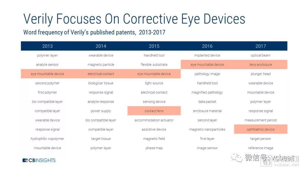 Verily不仅专注于检测眼部疾病,还关注潜在修复某些疾病。分析Verily授权专利中的词语频率,可以发现该公司提交与电接触材料、隐形眼镜和眼植入相关的专利。
