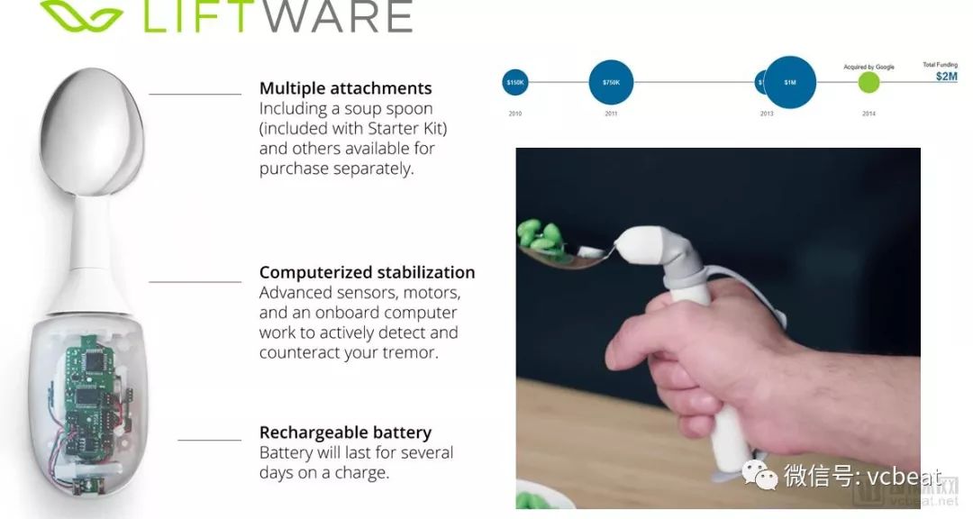 与此同时,Verily也在研究如何帮助帕金森患者管理他们的日常生活。在这方面,Verily首先是收购了Liftware智能勺的创建者Lift Labs,它帮助帕金森患者在吃东西时稳定食物,汤匙和相关附件售价195美元起。