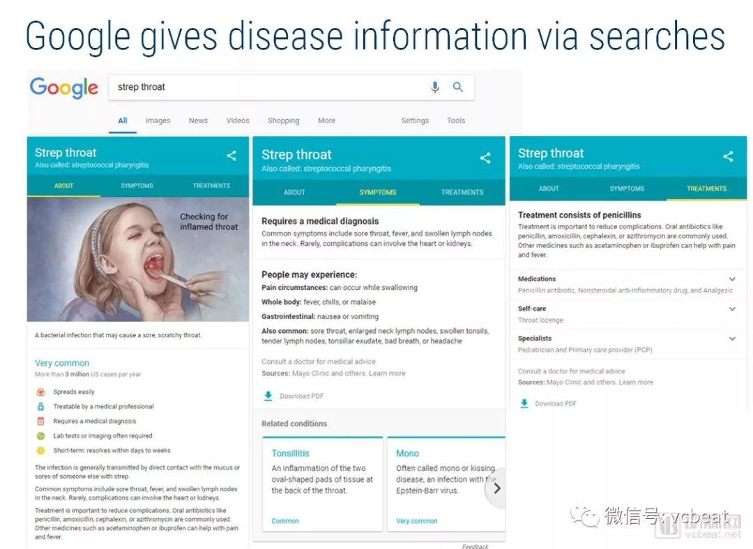 然而,该公司确实有一些面向患者的健康评估工具,包括2015年推出的健康卡,这是谷歌与梅奥诊所合作提供疾病信息,症状和常见健康状况的治疗,与WebMD的用例类似。