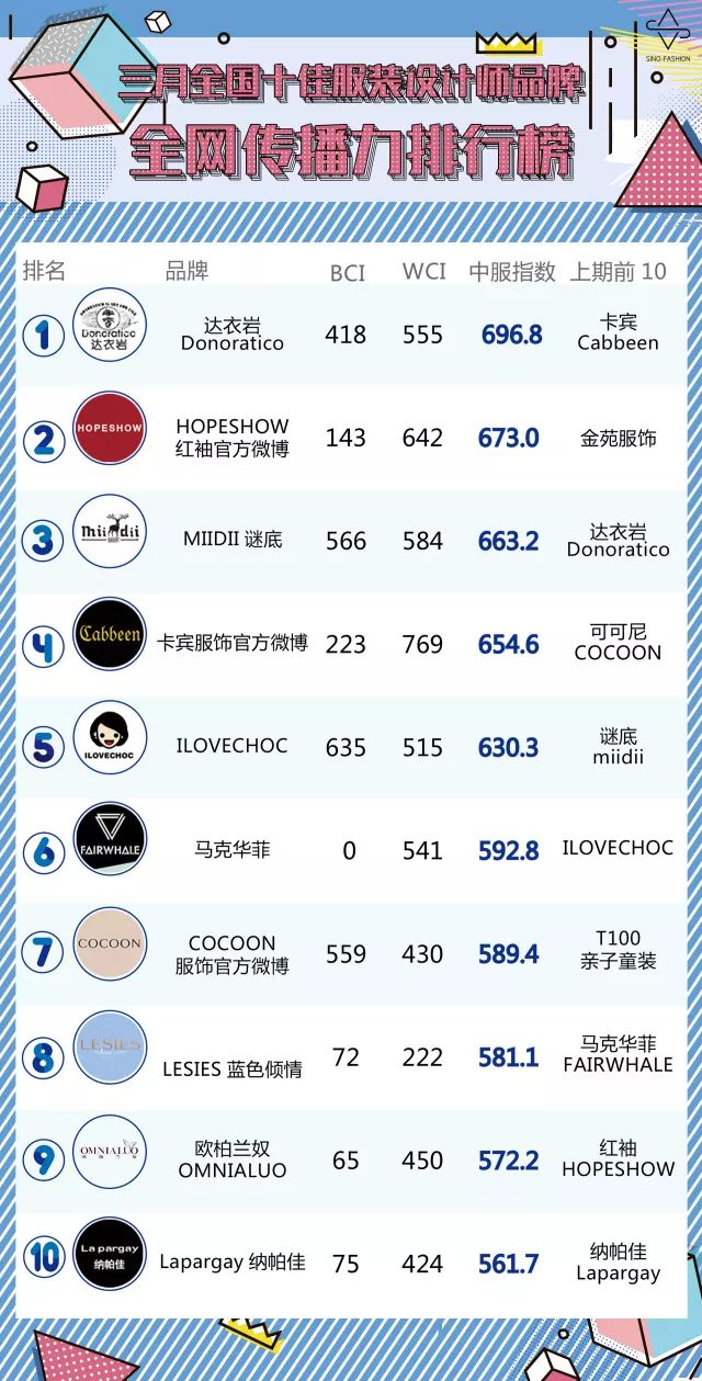 本期榜单的数据来源:中服数据库中3月1日0:00至3月31日24:00的所有十佳服装设计师品牌的微博、微信、电商平台、搜索引擎等相关数据。