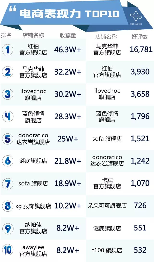 榜单分析:马克华菲、红袖、ILOVECHOC和蓝色倾情包揽了前4个位置,收藏量和好评数整体下降幅度很大,分析得出收藏量和好评数有一个正比关系,往往收藏量多的店铺好评数也较多,反之亦然。