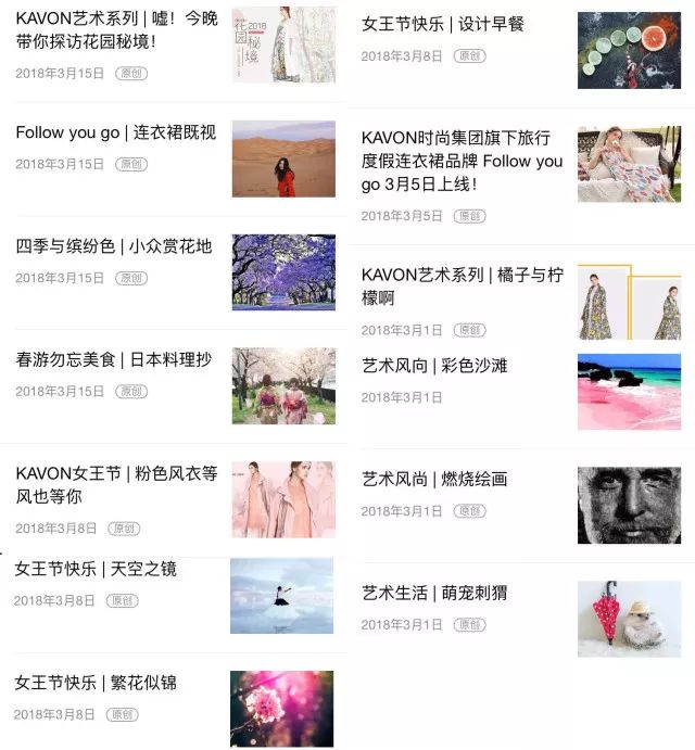 卡汶的公众号在3月发布了4次共13篇文章。从封面和标题可以看出这是一个极具艺术美感的品牌。